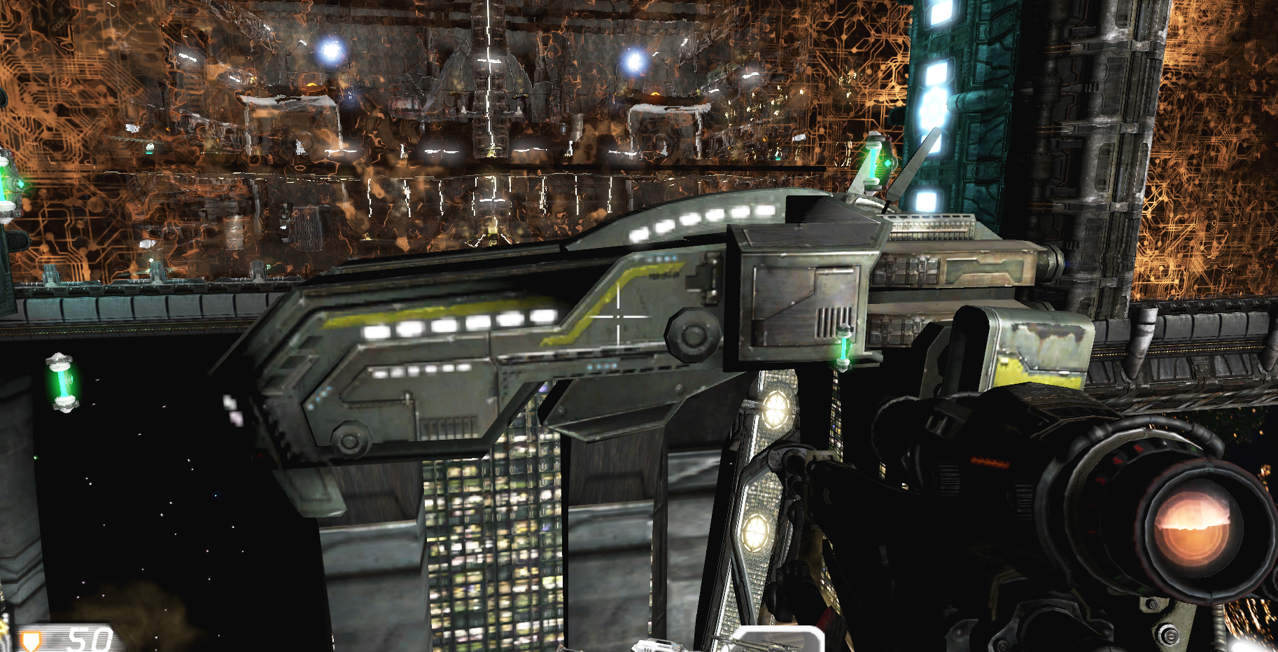 A dynamic physics volume is attached to the ship that patrols the space station. If any player touches the volume, they are instantly killed and gibbed into small pieces. The announcer states “Denied” and a warning message is displayed to all players about the dangers of passing ships.