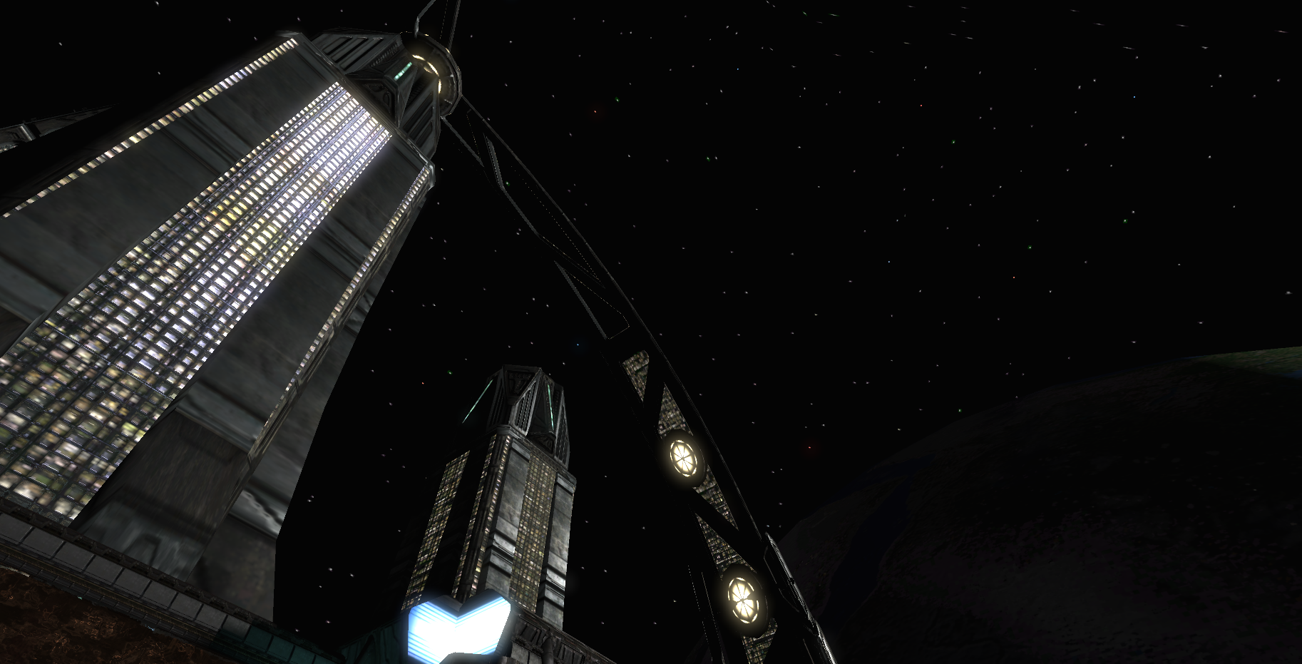 Keeping up with the theme of all Unreal Tournament 3 maps, the non-playable area is grand and magnificent in scale. The space station tower looms over the playing area as a futuristic arena stadium to view the deathmatch. The towers arms rotate around the station providing life to what would have been a static background.