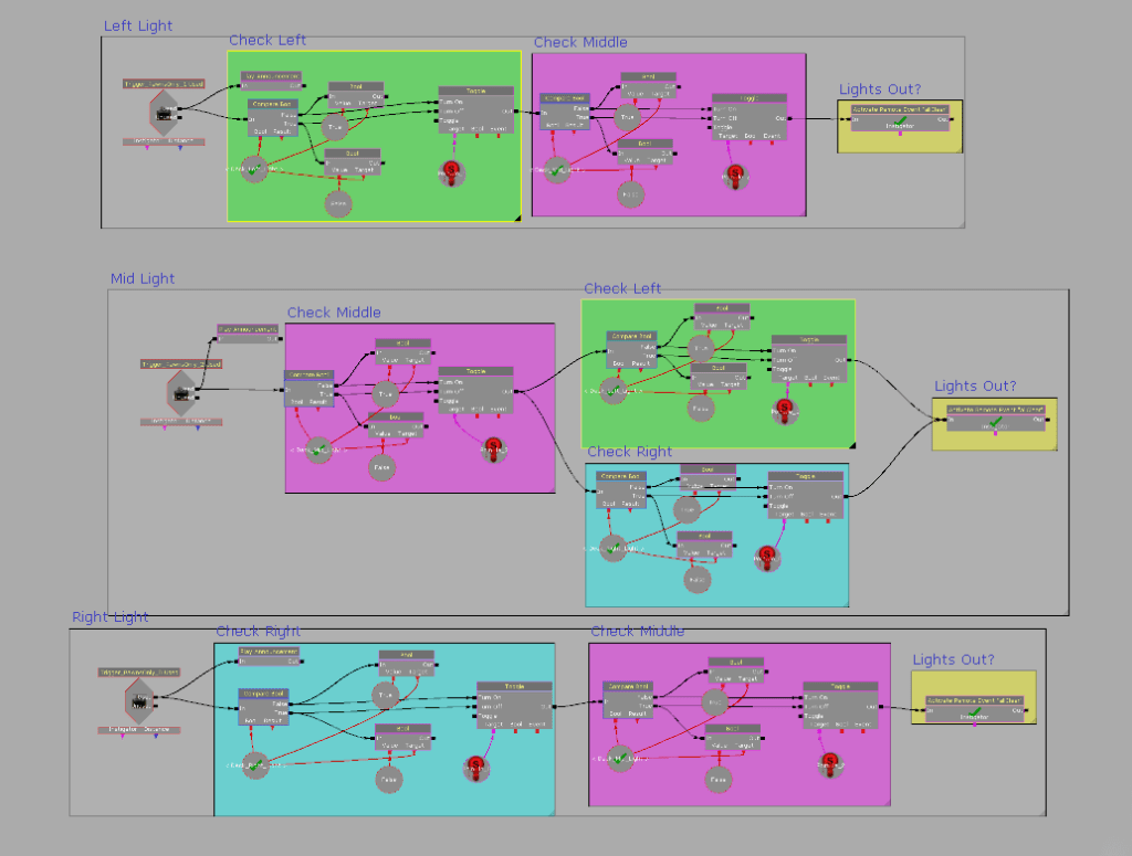 This section of kismet is a proof of tech for a “lights out” mini game for Brig. The mini game has three lights lined up in a row; the goal is to turn off all the lights. Every time you toggle a light, the adjacent lights toggle also. Although the tech is only for a 1 x 3 grid, this tech can be used further to create a 3 x 3 grid, like the original “Lights Out”. Each time the player toggles a switch, a boolean also is toggled keep track of the status of the light.