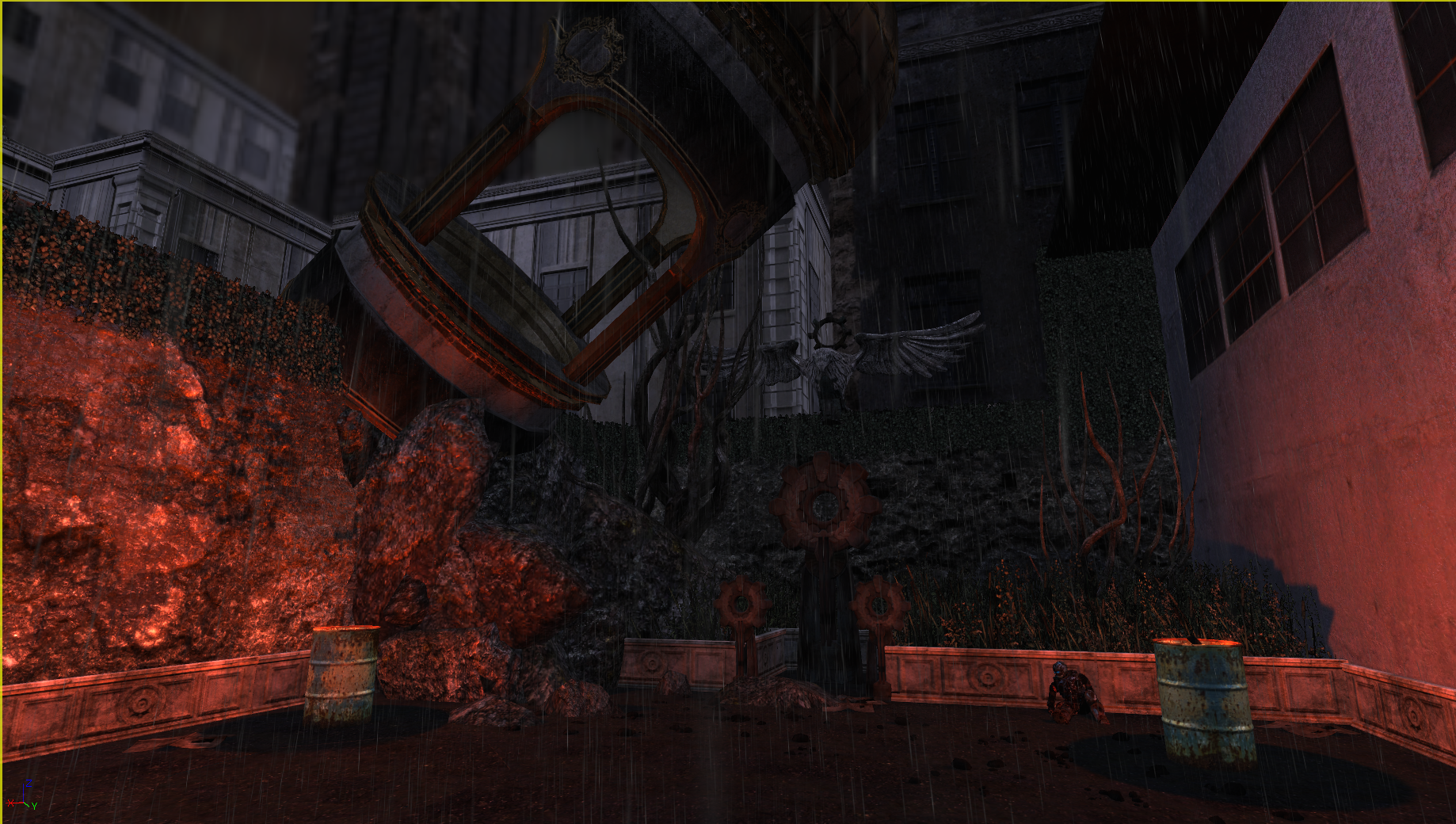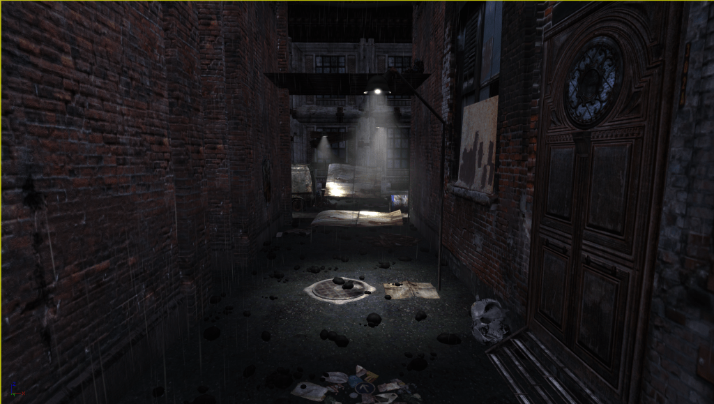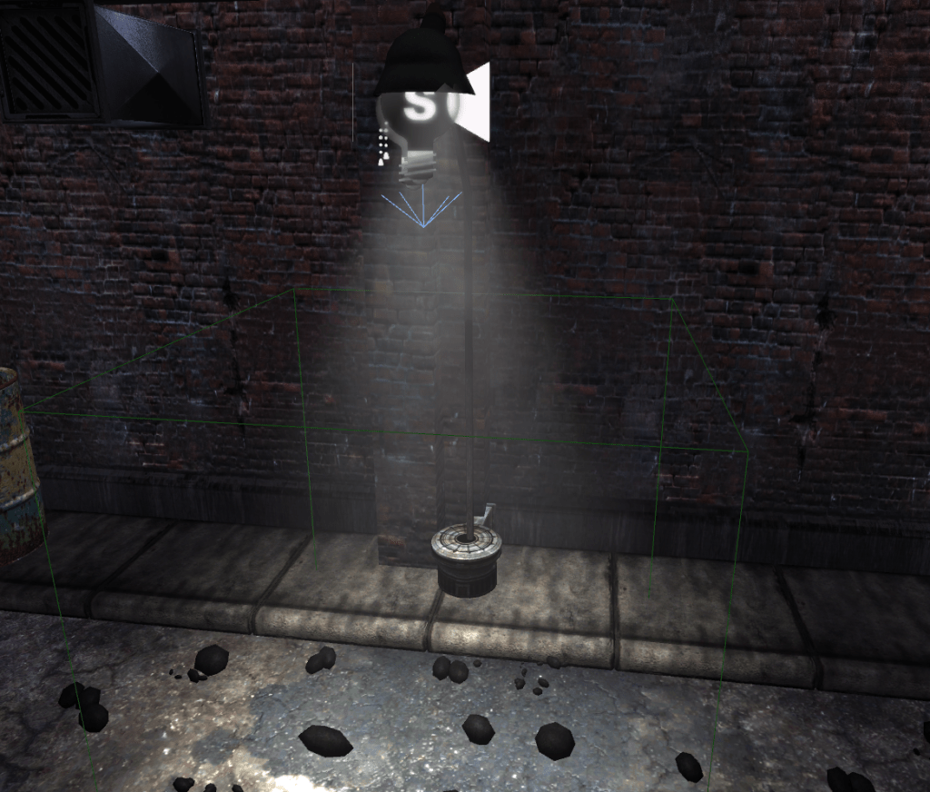 Each light in the level, consists of a static mesh light (that receives the damage), a light volume (to add the illusion of a night time street lamp), a trigger box at the ground level, a point light, and a spot light.