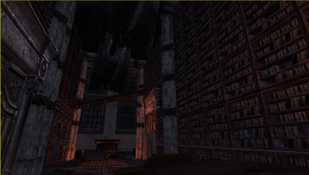The Gears of War universe has grand buildings with elaborate facades. The player rarely enters these buildings during the campaign. In From the Shadows, the player must escape detection by moving through one of these grand buildings. A design goal was creating an elaborate interior to match the grand exterior of the building. A library fits the grand theme and provides a great chance to convey the theme of destruction.