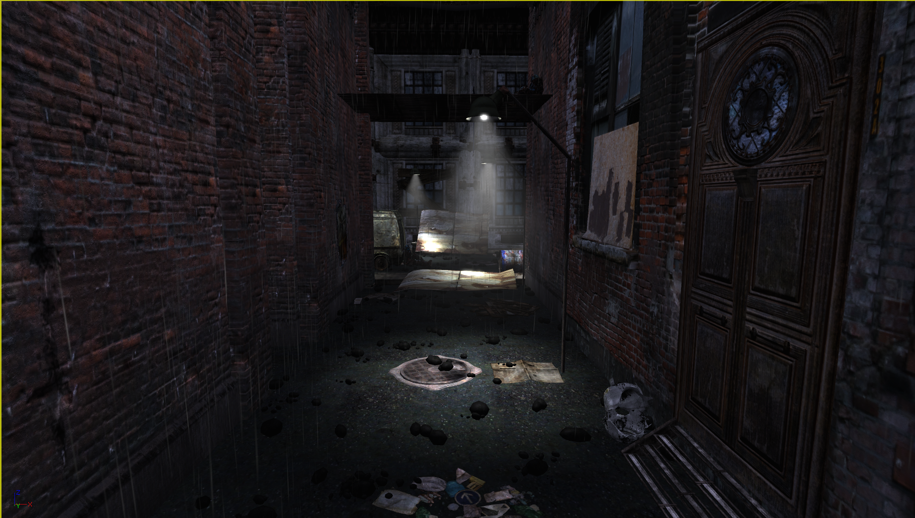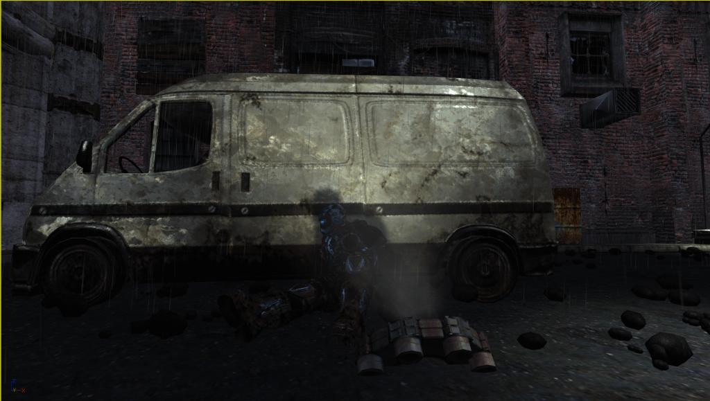 A fallen soldier provides a great opportunity add mood to the level. I enhanced the light map on the van so that his shadow stands out more. The soldier also serves a second objective, he is dead in the light, a subtle way to enforce the idea that direct light will bring death to the player.