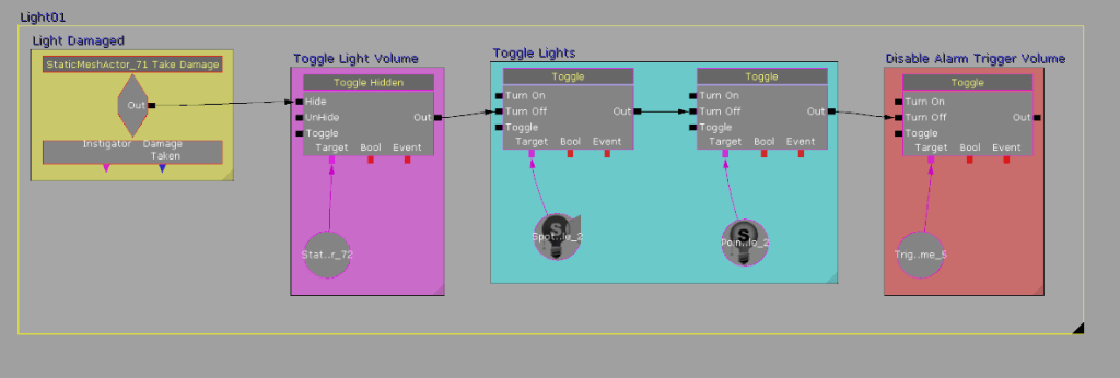 When the street lamp static mesh takes damage, the light volume is toggled to hidden, both lights are toggled off, and the trigger box is disabled, allowing the player to safely continue through the level without raising the alarm.