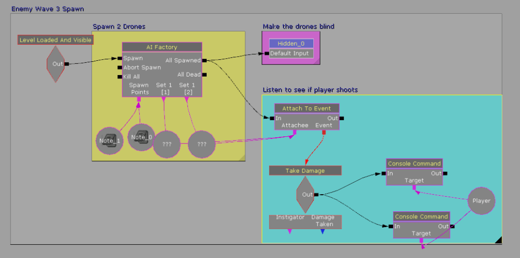 A sample of spawning 2 Drones. The section labeled, “Making the drones blind”, fires two console commands changing the sight and hearing range of the drone class to 200 Unreal Units. Both drones are attached to another section of kismet (the blue area), this section returns the sight and hearing of the drones back to normal when either of the drones in the squad takes damage, giving the appearance that the drones saw where the shot came from and now engage the player.