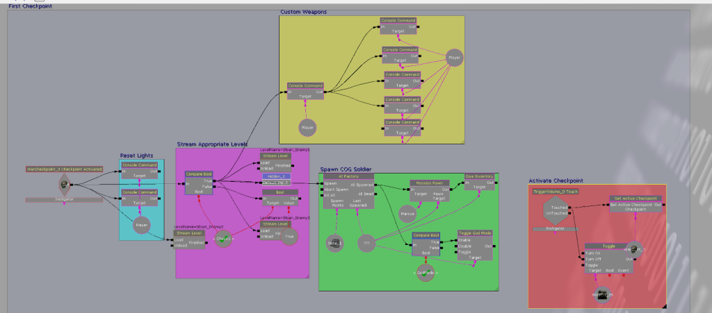 This section of kismet shows how to script a checkpoint for a non-Marcus character, in this case, Carmine. When the player returns to a checkpoint by either selecting it from a menu or dying and restarting at the point, they spawn as Marcus. Before the player notices, I reset the lights they they shot out after passing through the checkpoint initially, reset the sight of all Locust forces to “blind”, re-stream the appropriate levels/encounters, spawn Carmine, posses Carmine, hide Marcus in a small closet area, give the player silenced weapons and check to see if they were playing in god mode.