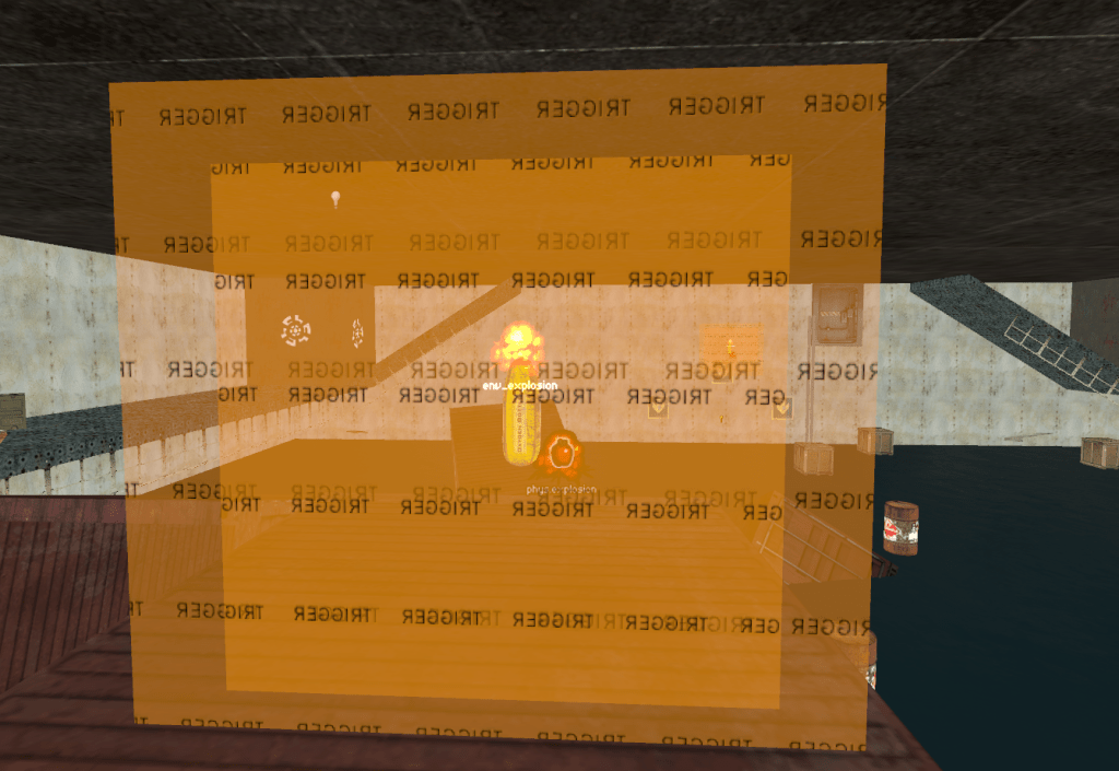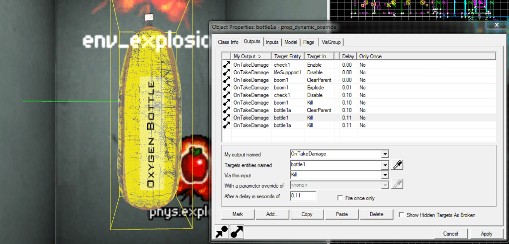 Scripting the Oxygen Bottle contains 2 trigger volumes and physics explosion and an environment explosion. All are parented to a clipboard as a prop_physics to float correctly. The actual oxygen bottle that is seen in game is parented to the clipboard also. The inner trigger box is the exact range of the player’s reach, so that when the player holds the bottle, the suit is supplied with infinite oxygen, thus allowing the player to swim freely while holding the bottle. The outer trigger box serves as a filter to detect when the bottle is close enough to a destructible item. When the bottle takes damage, both explosions are set off and the triggers are destroyed.The oxygen bottle can only be destroyed by the player, not enemy zombies. This is done with a filter that checks who caused the damage to the bottle.