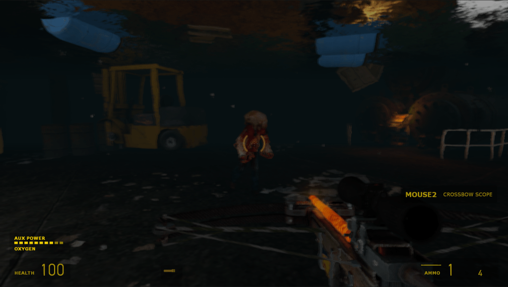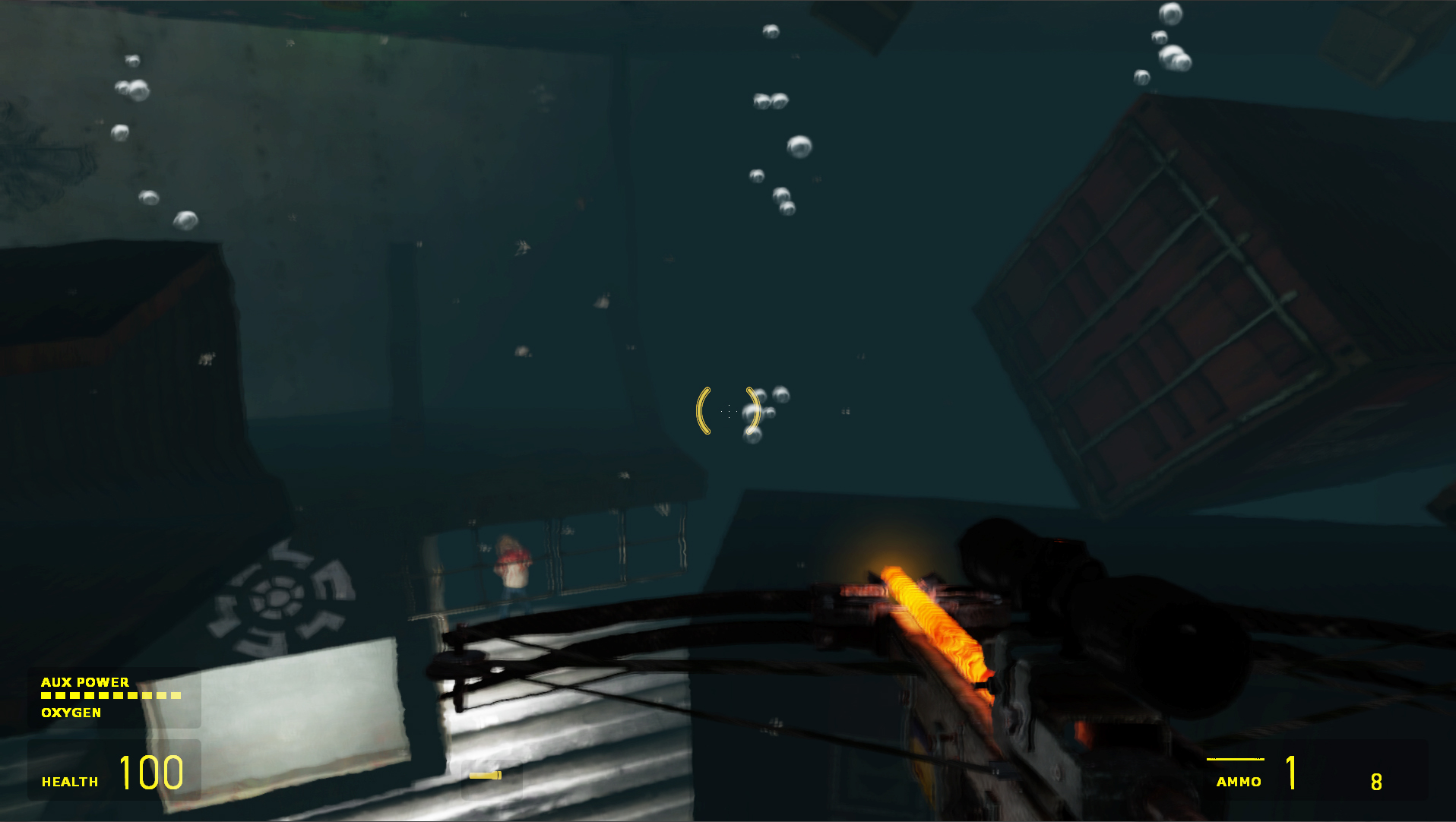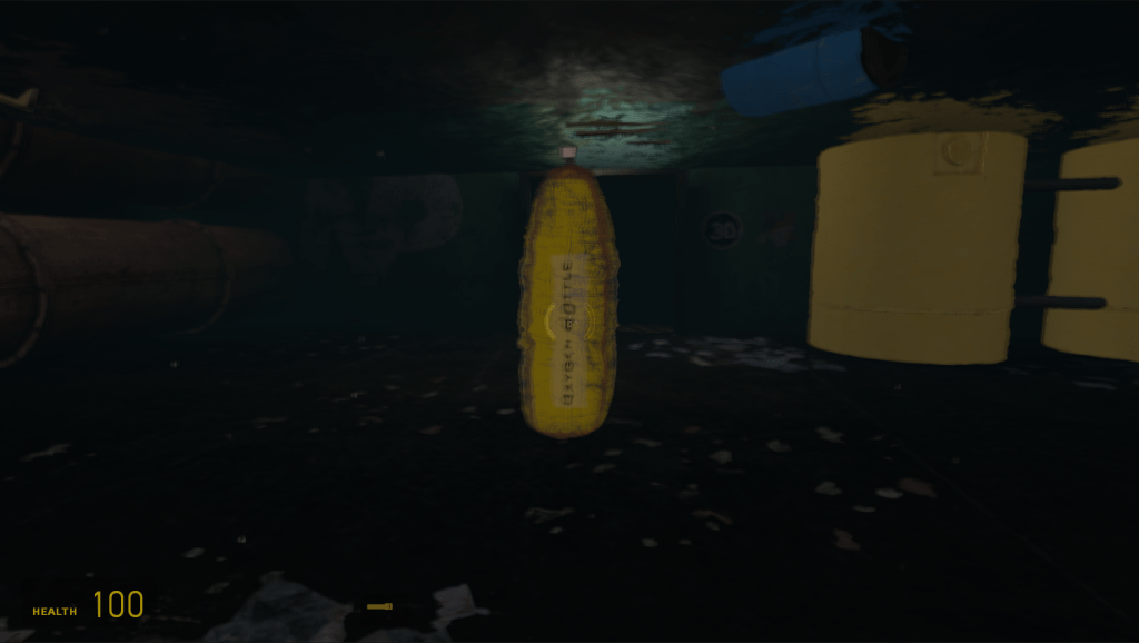 By picking up the oxygen bottle, Gordon is provided with an unlimited oxygen supply. The bottle does not allow Gordon to interact with anything underwater or use any weapons while holding the bottle. This provides a great opportunity for player choice: hold on to the bottle and have air OR drop the bottle and deal with a zombie.