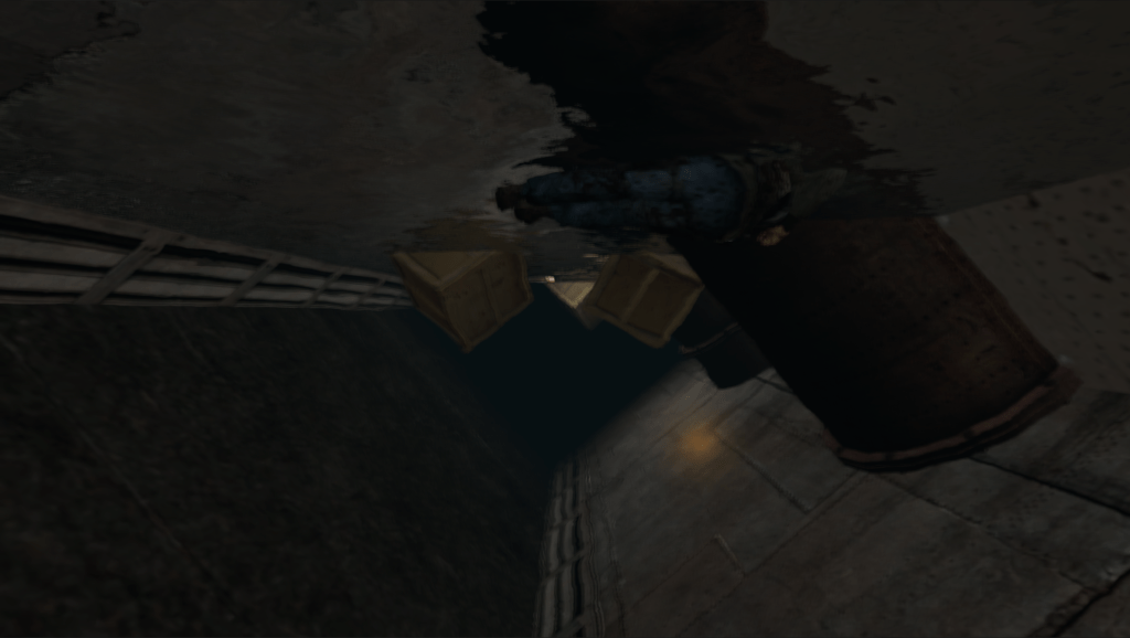 By creating a hallway and making it func_door which rotates, the player is under the illusion that the boat is flipping. Physics objects slosh about the hallway adding to this illusion. My inspirations for this moment was the movie, The Poseidon Adventure and the boat level from the recently released game, Uncharted 3: Drake’s Deception, by Naughty Dog.