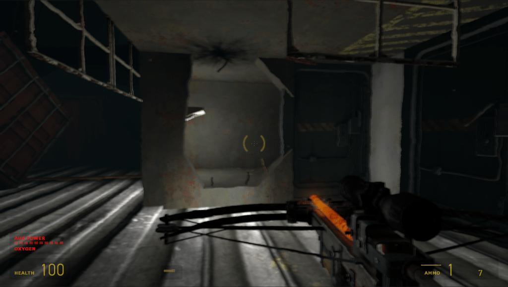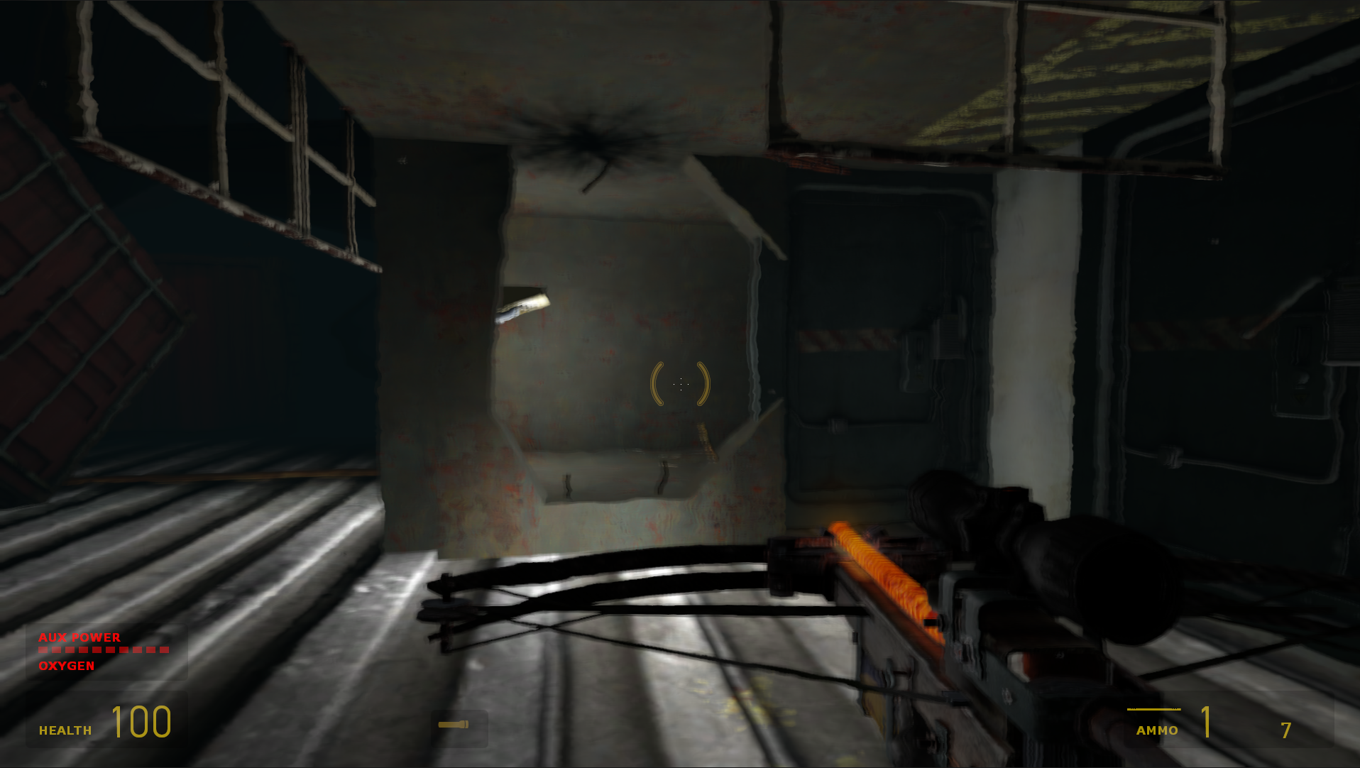 Overview: I’m on a boat!, a single player level for Half Life 2: Episode 2, requires the player to manage their oxygen resource while fighting their way off a sinking ship, infested with Zombies and Headcrabs. The player must make a decision on holding their oxygen tank for more oxygen or wielding a weapon to defend themselves, both cannot be done at the same time. The sinking ship provides a dynamic water environment as water levels change causing physics objects to respond appropriately. The oxygen bottle can also act as an explosive allowing the player to destroy a wall or blow enemies away, similar to the final scene in Jaws.