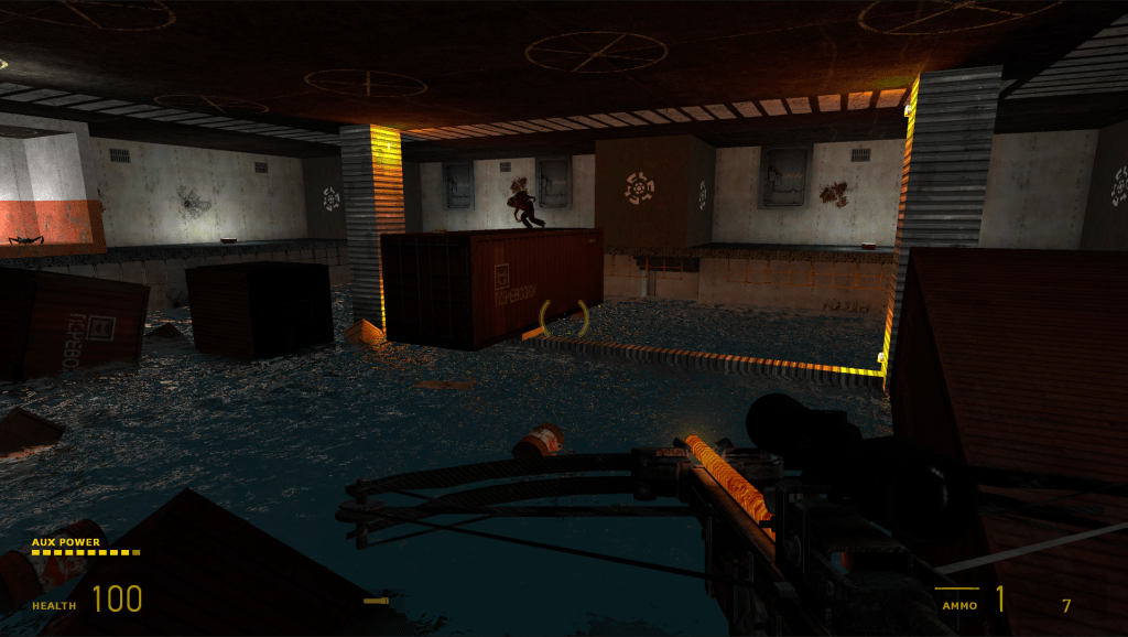 After the boat flips, the player enters a container room that has gone to hell with containers thrown about during the boat turning sequence. Air leaks out of the damage containers and act as a guide to the submerged control booth. A zombie lurks where the player must detonate the oxygen bottle.