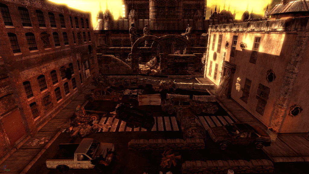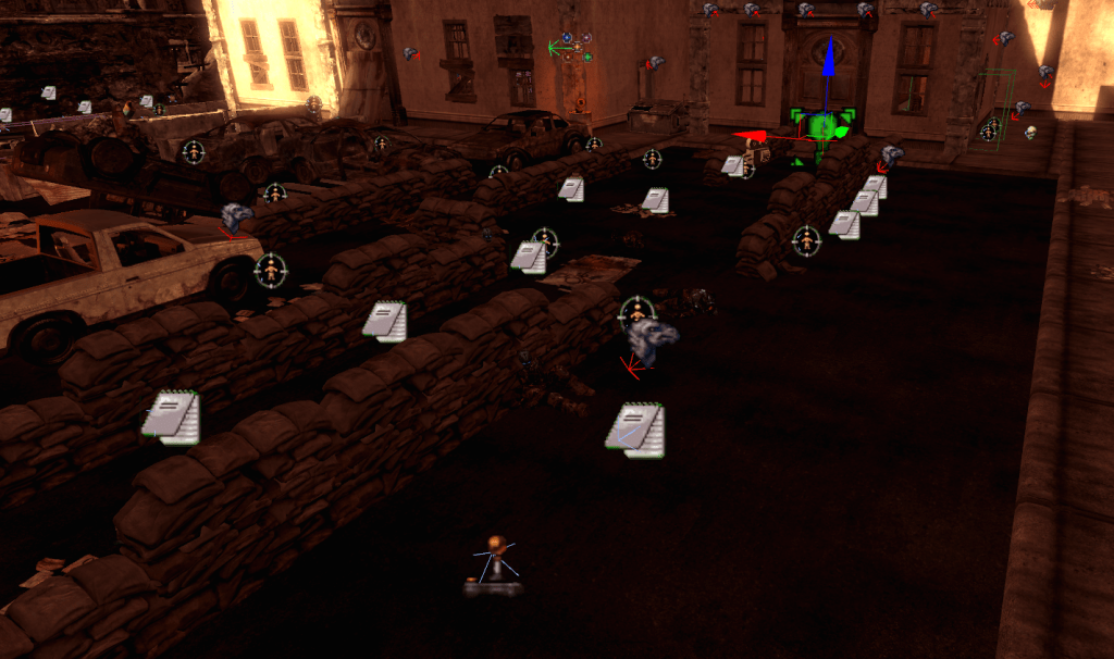 Urban Trench Warfare. Sandbags and Vehicles provide makeshift cover for both the COG and Horde forces. The COG soldiers spawn on the notes seen in the image above. With no viable path nodes other than advancing cover, the soldiers cannot follow the player through the flank. A blocking volume divides the Horde/COG sides preventing any “over zealous” NPCs from advancing too far ahead. Poor lines of sight in the trenches keeps both forces fighting and the body count low.