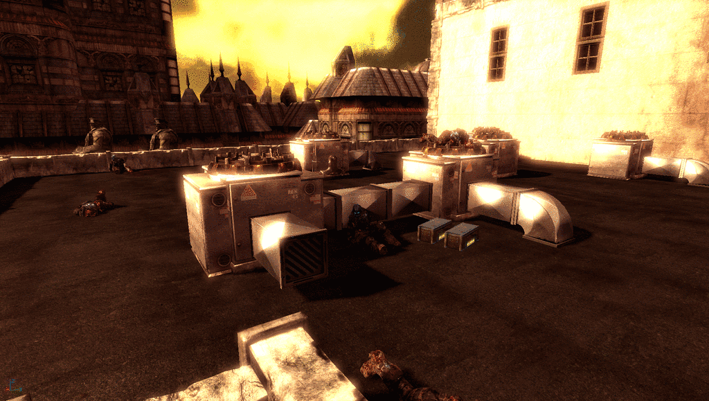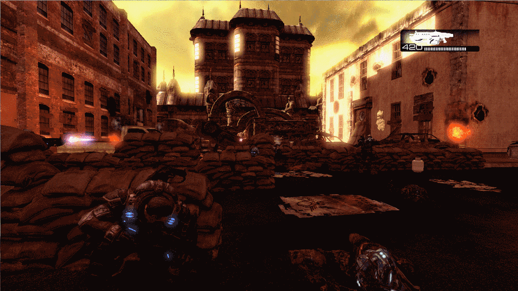 An above view of the streets shows the layout of the “urban trench warfare”, the layout is pretty simplistic, but with dozens of Drones and friendlies trading volleys at each other, the field appears extremely hectic. A bright directional light and sharp shadows help sell the feeling of early dawn. Random explosions and sounds of near bullet misses add to the tense setting. Heavy scripting of both the COG and Locust forces keep the sides balanced.