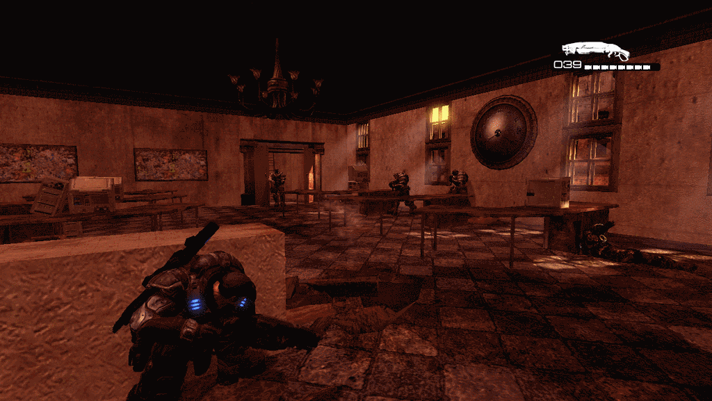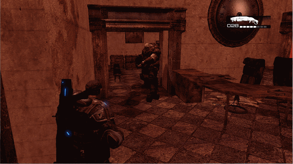 Reaching the second floor gives a small opportunity to watch enemies interact with the battle down below. Once the player is discovered, the Drones will stop shooting the COG forces on the ground and will attack the player. Desks provide poor cover for both the Drones and Marcus. A well placed grenade, before being discovered, can simplify this encounter.