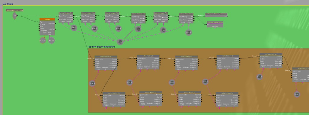 Air strike kismet. Upon defeating the seeder, the last level loads in starting the final camera cinematic. During the matinee, multiple rounds of dummy fire, firing boomer shoots, towards the Horde side of the level. During this air strike, multiple particles spawn creating the cinematic explosions. During the last few moments of the air strike, a command fires killing all remaining Horde forces.