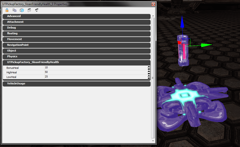 I created a custom health pickup that extends from the medium health class. I used a mesh I created as the new health pickup. This health pickup gives you +10 health if you are at 100 or more health (but does not exceed 200 after the heal), gives you 25 health if you are between 26 – 100, and gives you 50 if you are 25 and below.